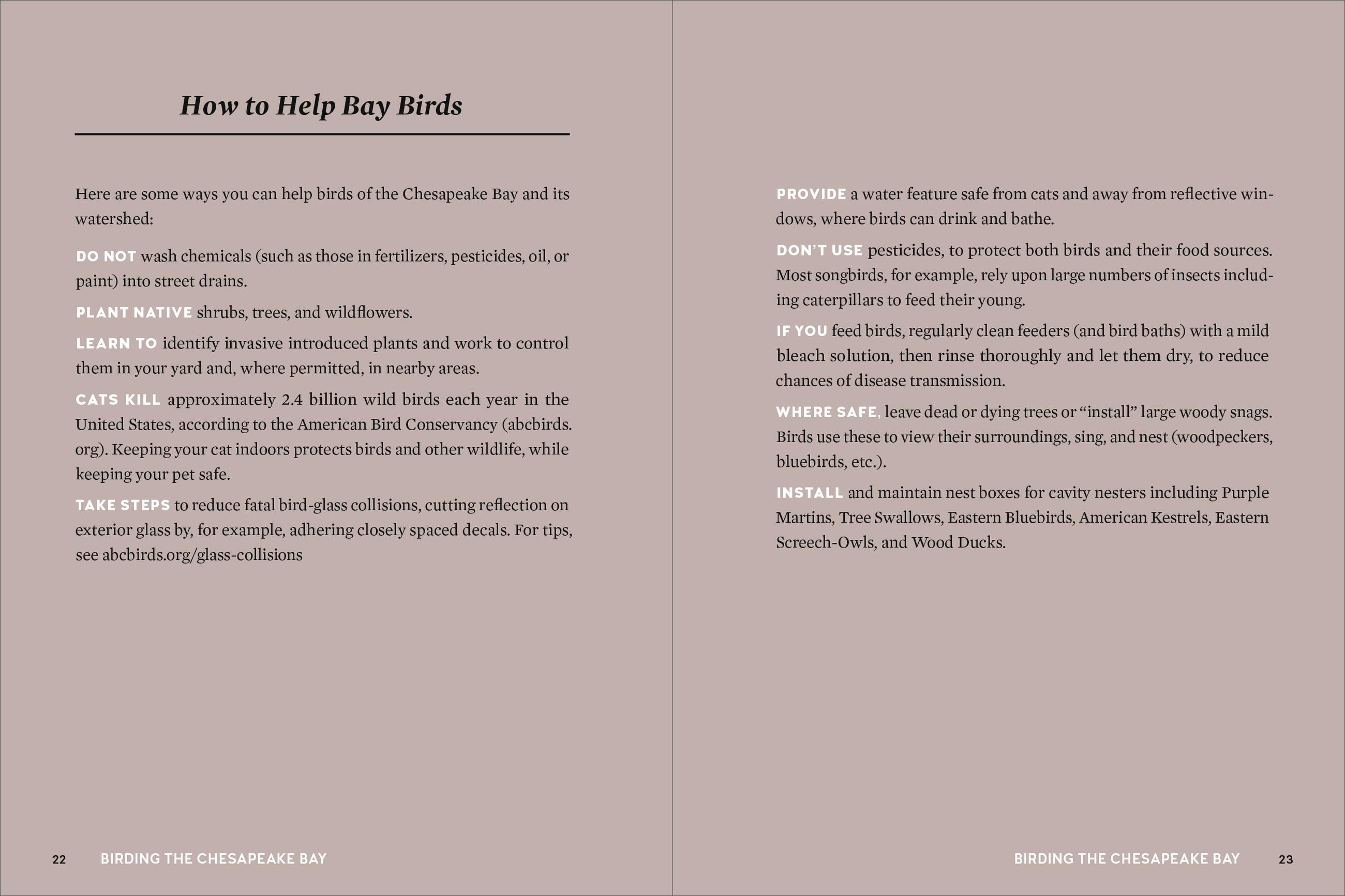 The Chesapeake Bay is the largest estuary in the United States, and the different habitats found on the North, South, East, and West Bay make for year-round birding. Without trying hard, you’ll likely see some of the Bay’s spectacular birds—diving Ospreys in summer, geese flocking in fall and winter, and Great Blue Herons stalking the shallows in any month. This easy-to-use book will help you identify more than 100 commonly occurring birds that help make the region the natural wonders that it is. An emphasis on best practices and habitat sustainability help empower conservation and ensure that birding around our most precious resources will be possible for years to come. Perfect for budding and experienced birders alike, this sleek and compact guide is the ideal travel companion for every trip to the region.